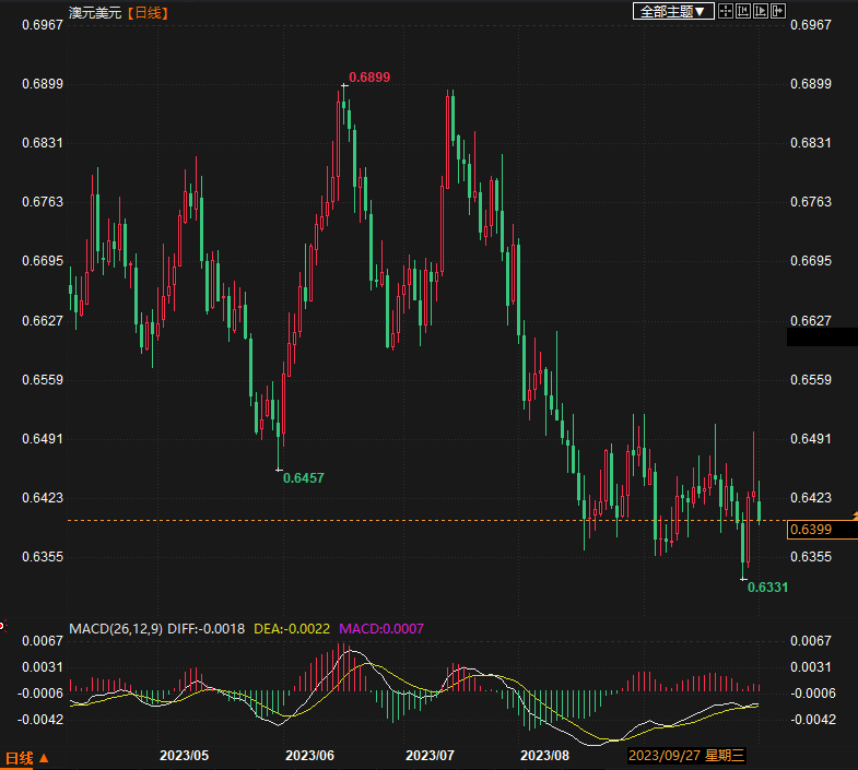 澳元兑美元货币对也对疲弱的中国经济数据做出了反应。财新服务业 PMI 从 8 月的 51.8 降至 9 月的 50.2,降幅大于平均预期的 52.0。制造业PMI也从51.0下降至50.6,低于预期的51.2。